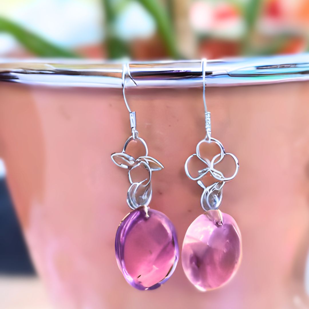 Boucle "Aube ", d'oreille avec une Amétrine bolivienne naturelle, fusion harmonieuse d'améthyste et de citrine , et dont le rose rappelle le Quartz Rose, surmontée d’une maille discrète en argent 925 pur.