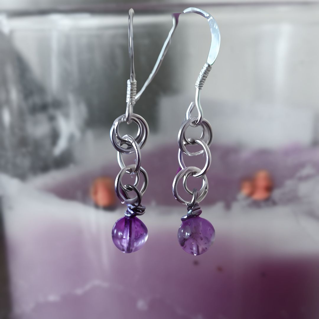 "Boucles d’Oreilles 'Astriel'" : ornées d'améthystes avec inclusions naturelles malgaches montées sur une maille de doubles anneaux en argent 925, disposés comme des astres en harmonie céleste.